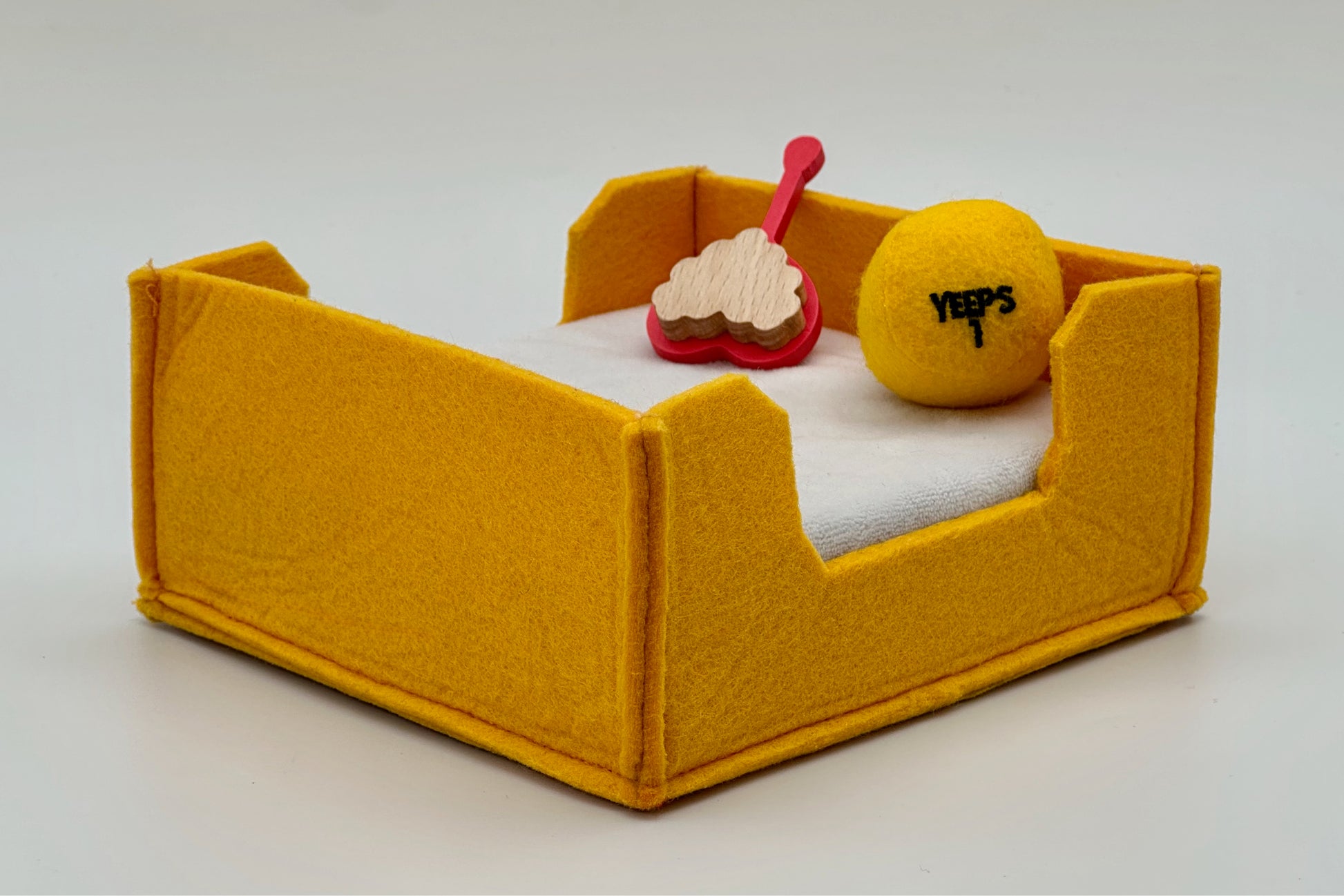 You get one 3" tall (7.5cm) Yeeps Plush Pet (your choice of Dog, Cat, or Chicken), a 6x6x3” reinforced pillow block box, a felt pet bed with a folding pillow, a magnetic tennis ball, and a pet brush.